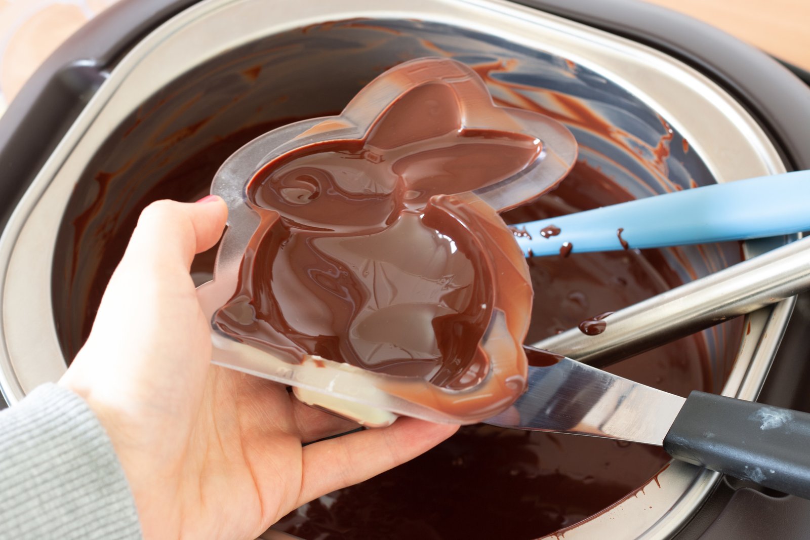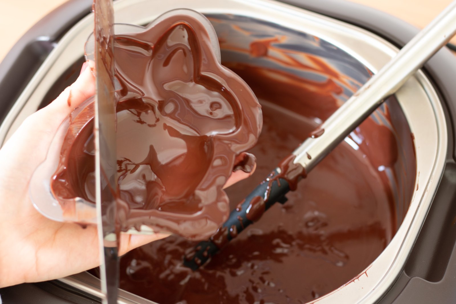 Il existe une autre technique pour les figurines en chocolat : le pinceau de cuisine. Très pratique pour recouvrir l’ensemble du moule petit à petit afin d’obtenir l’épaisseur souhaitée. A vous de voir ce que vous préférez.