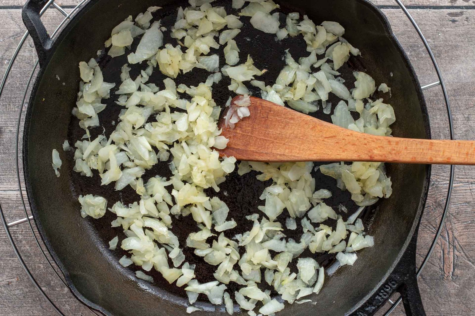 - Dans une poêle faites revenir quelques minutes l’oignon émincé finement avec un filet d’huile d’olive.