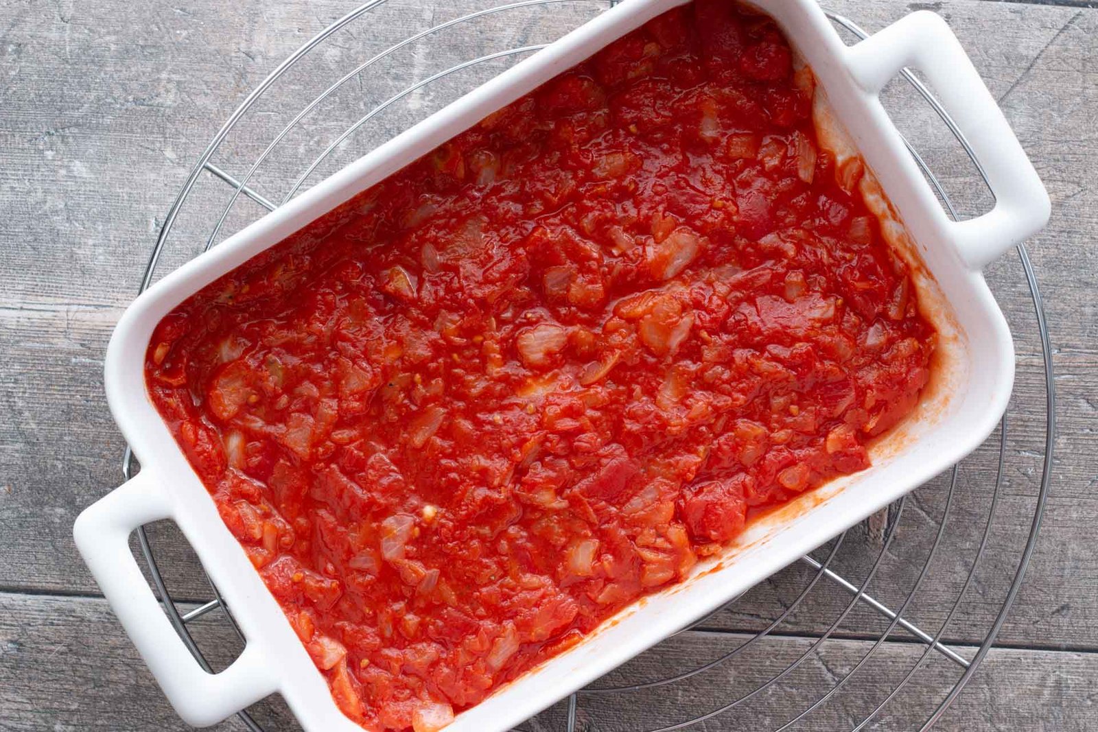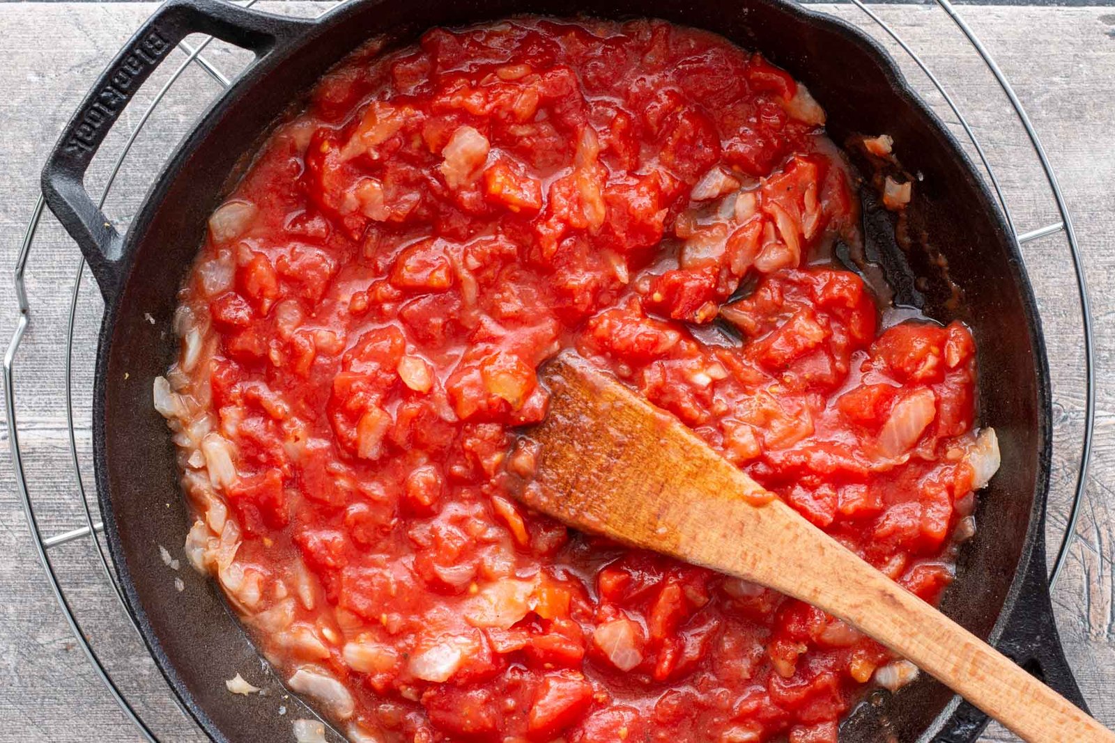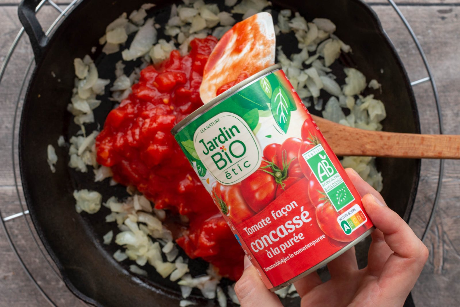 - Versez la tomate concassées, salez et ajoutez les herbes de votre choix (basilic, thym, origan...). Laissez cuire doucement jusqu'à ce que la sauce épaississe.