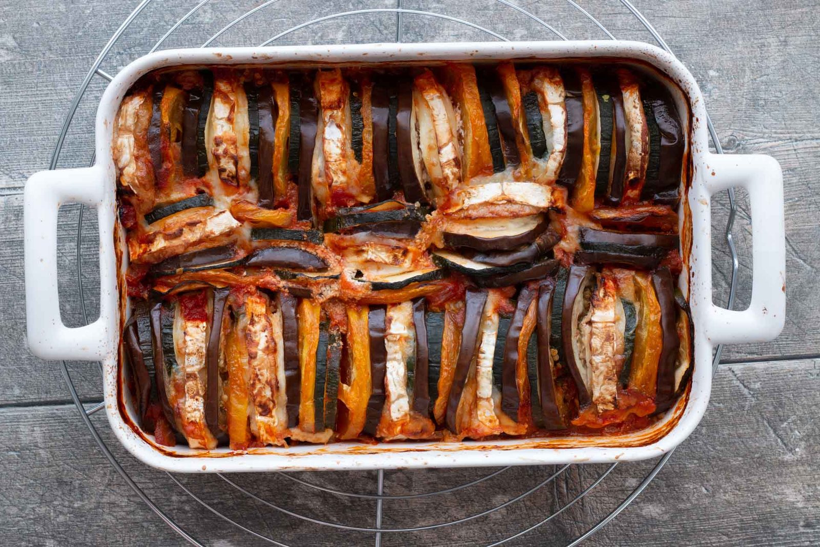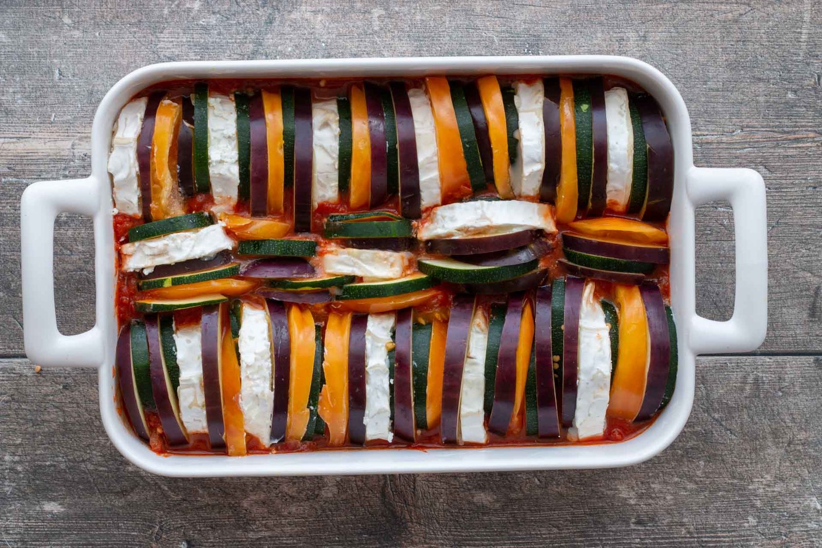- Disposez dans le plat à gratin les tranches de légumes/fromage : aubergine, courgette, tomate, tranche de chèvre. Serrez bien les tranches car les légumes diminuent de taille lors de la cuisson.