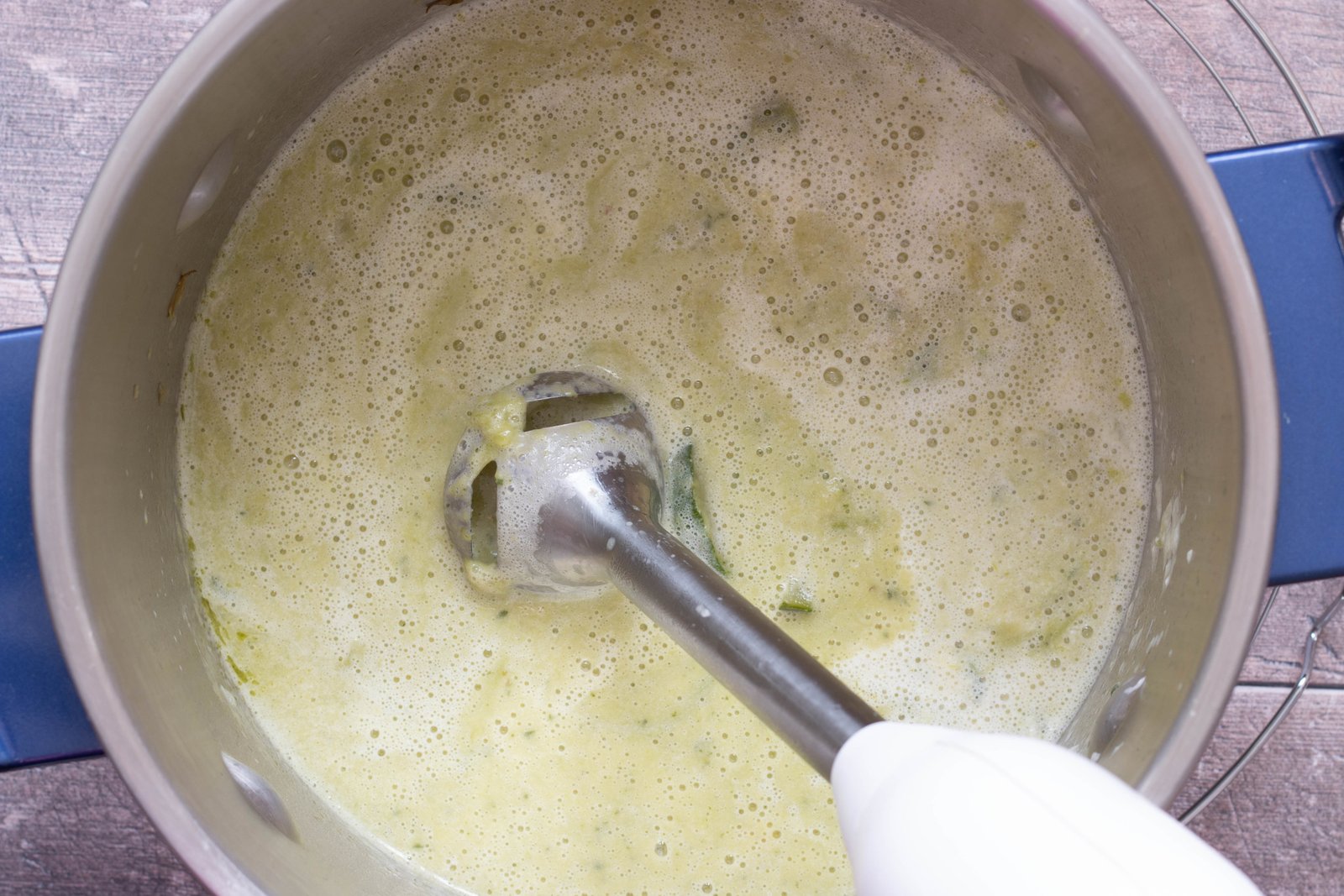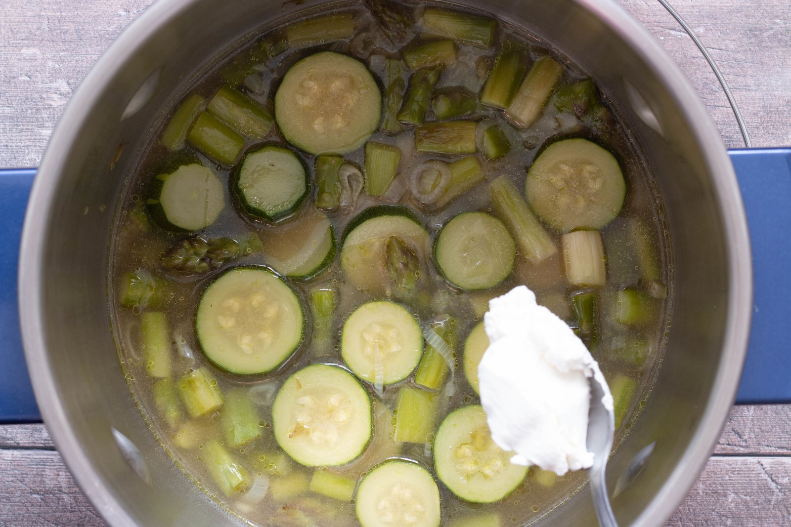 - Lorsque le tout est suffisamment cuit, ajoutez 1 cuillère à soupe de chèvre frais et mixez avec un blender ou au mixeur plongeant. Goûtez et rectifiez l’assaisonnement si nécessaire.