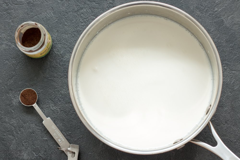 - Faites chauffer le lait à feu moyen sans le porter à ébullition pendant 10-15 min. Remuez au fouet de temps en temps.