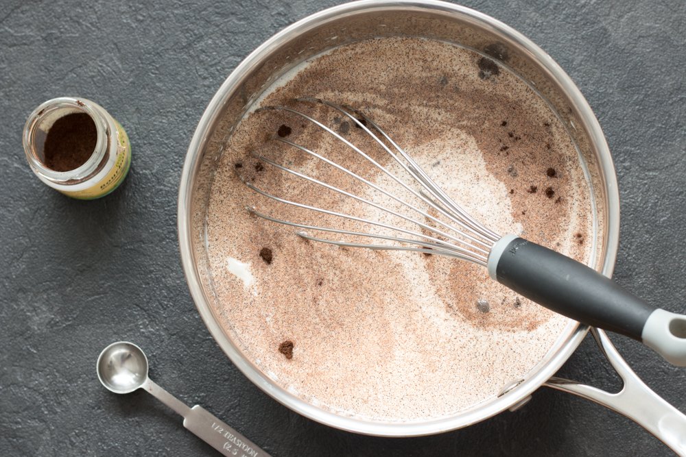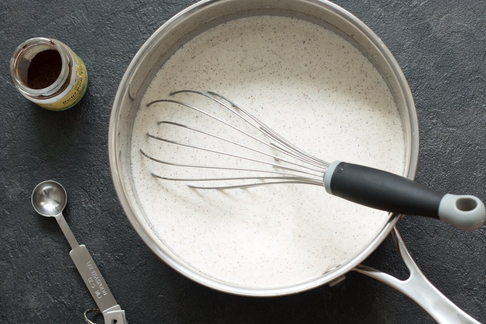 - Versez le lait dans une grande casserole avec 1/2 cuillère à café de vanille en poudre. Fouettez l’ensemble pour que la vanille se mélange bien au lait.